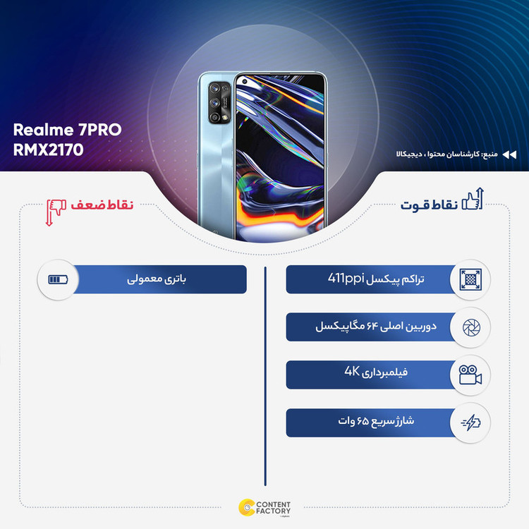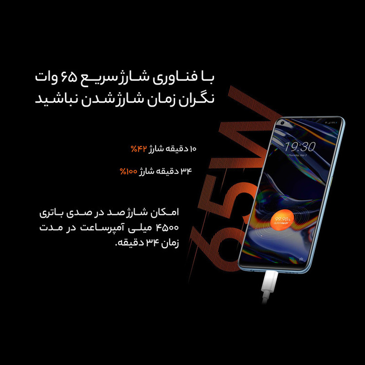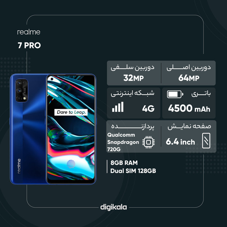 برند ریلمی یکی از برندهای زیرمجموعهی کمپانی اوپو (oppo) است که با وجود نوظهور بودن آن، امروزه به عنوان یکی از برندهای محبوب تولید موبایل و گجتهای هوشمند و ابزار دیجیتال محسوب میشود که میتوان تولیدات آن را با محصولات شیائومی و دیگر برندهای میانرده مقایسه کرد. گوشی موبایل ریلمی مدل 7PRO RMX2170 با قابلیت قرار دادن دو سیم کارت و ظرفیت 128 گیگابایتی همراه با رم 8 گیگابایت دارای طراحی زیبایی است که در سپتامبر 2020 به بازار عرضه شده و نسبت به کارایی قیمت مناسب و ارزش خرید بالایی دارد. تراشه اسنپدراگون (Qualcomm SM7125 Snapdragon 720G) به همراه پردازنده گرافیکی Adreno 618 سرعت و کیفیت بالایی را برای این موبایل به ارمغان آورده است. صفحهنمایشی با پنل Super AMOLED و تراکم پیکسلی 411 پیکسل بر هر اینچ در این مدل از تولیدات ریل می به چشم میخورد. این محصول بنا به ادعای شرکت سازنده دارای قابلیت شارژ سریع با توان 65 وات و باتری لیتیوم پلیمری با ظرفیت 4500 میلیآمپر ساعت است که این قابلیت شارژ سریع در کنار ظرفیت بالای باتری شما را از شارژ مداوم و طولانی مدت موبایلتان بینیاز خواهد کرد. گوشی موبایل ریلمی مدل 7PRO RMX2170 دو سیم کارت ظرفیت 128 گیگابایت و رم 8 گیگابایت میتواند یک انتخاب هوشمندانه برای شما باشد تا از گوشی موبایل خود و کارهایی که از آن برمیآید لذت ببرید.