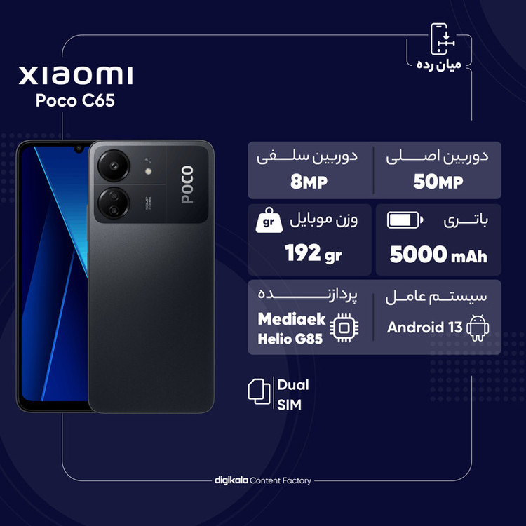 شاید شما هم به دنبال خرید گوشی هوشمندی باشید که در کنار بهره بردن از مشخصات فنی مناسب، قیمت مقرون بهصرفهای هم داشته باشد و شیائومی Poco C65 میتواند یکی از انتخابهای مناسب برای شما باشد. این گوشی به نسبت قیمت در نظر گرفته شده از مشخصات فنی مناسبی بهره برده است. در نمای روبهرویی این گوشی به صفحهنمایش با ابعاد 6.74 اینچ و رزولوشن 720×1600 پیکسل از نوع IPS مجهز شده که توانایی نمایش 260 پیکسل در هر اینچ را دارد. در مورد صفحهنمایش این گوشی باید بگوییم که باید توقعی در حد و اندازه یک گوشی اقتصادی را از آن داشته باشید و از طرفی نرخ بروزرسانی 90 هرتز آن سبب شده تا عملکرد به نسبت روان و بدون لگ داشته باشد. در قسمت پشتی این گوشی شاهد قرارگیری یک سنسور دوربین اصلی با رزولوشن 50 مگاپیکسل در کنار سنسور 2 مگاپیکسل ماکرو هستیم. سنسور دوربین اصلی 50 مگاپیکسل این گوشی برای عکاسی در نور روز و در جایگاه یک گوشی میانرده میتواند توقعات شما را تا میزان بسیار زیادی برآورده کند. دوربین سلفی 8 مگاپیکسل هم برای برقراری تماسهای تصویری عملکرد بسیار خوب و کاملا قابل قبولی دارد. حضور پردازنده هلیو G85 شرکت مدیاتک هم سبب شده تا شیائومی Poco C65 در اجرای بازیهای نهچندان سنگین و فعالیتهای روزمره، عملکرد روان و مناسبی داشته باشد. این گوشی به باتری با میزان ظرفیت 5000 میلیآمپرساعت مجهز شده که باید بدانید به ازای هر بار شارژ صد درصدی، توانایی ارائه زمان آماده بهکار یک و نیم روز را برای حالت استفاده معمولی دارد. در مجموع باید بگوییم که با یک گوشی به نسبت اقتصادی روبهرو هستید که به ازای قیمت در نظر گرفته شده از مشخصات مناسبی بهره برده و از طرفی برای استفاده روزمره گزینه بسیار مناسبی است.