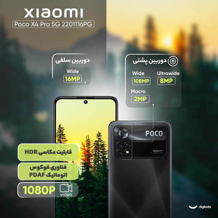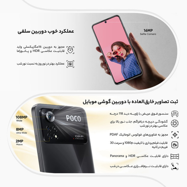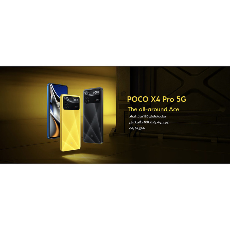 سری پوکو گوشیهای هوشمند میانرده شرکت شیائومی با توجه به قیمت در نظر گرفته شده به مشخصات فنی مناسب و کاملا قابل قبولی مجهز شدهاند و در بین کاربران محبوبیت بالایی دارند. یکی از گوشیهای میانرده و باکیفیت این سری، شیائومی Poco X4 Pro 5G است که در جایگاه یک گوشی میانرده به مشخصات فنی مناسبی مجهز شده است. در نمای روبهرویی این گوشی از صفحهنمایش با ابعاد 6.67 اینچ و رزولوشن 1080×2400 پیکسل از نوع سوپر امولد بهره برده است. این صفحهنمایش با توجه به توانایی نمایش 395 پیکسل در هر اینچ و نرخ بروزرسانی 120 هرتز، عملکرد بسیار خوب و باکیفیتی را بهشما ارائه میکند. در قسمت پشتی یک سنسور دوربین اصلی قدرتمند با رزولوشن 108 مگاپیکسل از نوع عریض در کنار سنسور 8 مگاپیکسلی از نوع فوق عریض (ultrawide) و سنسور 2 مگاپیکسل ماکرو، سنسورهای دروبین سهگانه Poco X4 Pro 5G را تشکیل میدهند. برای دوربین سلفی هم سنسور با رزولوشن 16 مگاپیکسل در نظر گرفته شده است. در بخش مشخصات سختافزاری هم حضور پردازنده اسنپدراگون 695 5G شرکت کوالکام سبب شده تا این گوشی عملکرد قابل قبولی را در اجرای بازیهای حتی سنگین همانند آسفالت 9 داشته باشد. البته نباید فراموش کنیم که به لطف حضور این پردازنده، Poco X4 Pro 5G توانایی پشتیبانی از شبکههای اینترنتی پرسرعت نسل پنجم یا همان 5G را هم دارد. باتری قدرتمند با میزان ظرفیت 5000 میلیآمپرساعت در کنار شارژر 67 وات مجهز به تکنولوژی شارز سریع (توانایی شارژ صفر تا صد درصدی در مدت زمان 41 دقیقه) از دیگر مشخصات در نظر گرفته شده برای این گوشی هوشمند میانرده هستند.