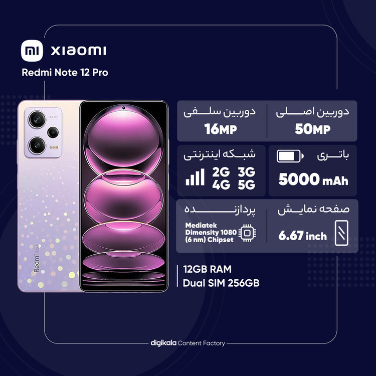 در بین گوشیهای هوشمند میانرده سری Redmi شرکت شیائومی، شاهد رونمایی برخی از گوشیهایی بودیم که در برخی از مشخصات فنی در نظر گرفته شده هیچ چیزی کم از یک پرچمدار مدعی و گرانقیمت نداشتند. شیائومی Redmi Note 12 Pro 5G هم یکی از این گوشیهای باکیفیت و ردهبالا است. صفحهنمایش 6.67 اینچی این گوشی با رزولوشن 1080×2400 پیکسل از نوع اولد که البته توانایی ارائه نرخ بروزرسانی 120 هرتز و حداکثر روشنایی 900 نیت (nits) را دارد، هیچ چیزی در ارائه کیفیت کم از یک گوشی پرچمدار ندارد. سنسور دوربین عریض با رزولوشن 50 مگاپیکسل که در نور روز و نور شب عملکرد عالی دارد در کنار سنسور 8 مگاپیکسل فوق عریض (ultrawide) و سنسور 2 مگاپیکسل ماکرو، سنسورهای دوربین سهگانه آن را تشکیل میدهند. دوربین سلفی 16 مگاپیکسل سلفی این گوشی هم در نور روز توقع شما را کاملا برآورده میکند. ضبط ویدیو با نهایت کیفیت 4K هم از دیگر قابلیتهای سنسور دوربین عریض این گوشی است. حضور پردازنده دیمنسیتی 1080 شرکت مدیاتک هم سبب شده تا این گوشی در اجرای بازیهای سنگین و بهروز دنیا و همچنین نرمافزارهای کاربردی، عملکرد بسیار درخشانی داشته باشد. باتری با میزان ظرفیت 5000 میلیآمپرساعت در کنار پشتیبانی از فناوری شارژ سریع با توان 67 وات، از دیگر مشخصات در نظر گرفته شده هستند. در مجموع اگر میخواهید گوشی قدرتمندی داشته باشید که به نسبت بسیاری از پرچمداران موجود در بازار قیمت ارزانتری داشته باشد، بدون شک شیائومی Redmi Note 12 Pro 5G میتواند یکی از بهترین انتخابهای ممکن برای شما باشد.