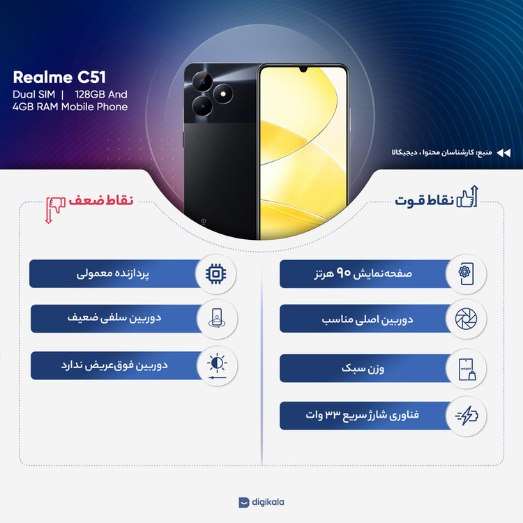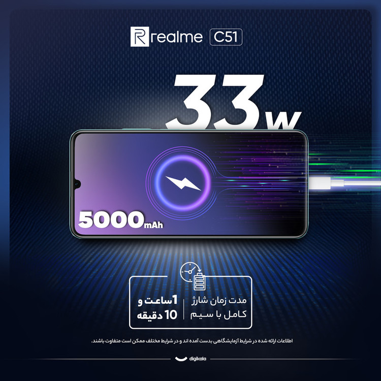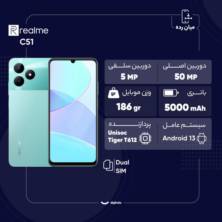 بسیاری از کاربران به دنبال خرید گوشیهای هوشمند میانردهای هستند که به نسبت قیمت مقرون بهصرفه، از مشخصات فنی مناسب و قابل قبولی بهره برده باشند و موبایل ریلمی مدل C51 یکی از گوشیهای میانرده با ارزش خرید بالا است. این گوشی به صفحهنمایش با ابعاد 6.74 اینچ و رزولوشن 720×1600 پیکسل مجهز شده که توانایی ارائه نرخ بروزرسانی 90 هرتز آن سبب شده تا عملکرد روان و بدون لگ را از آن شاهد باشید. در قسمت پشتی این گوشی هم سنسور دوربین اصلی با رزولوشن 50 مگاپیکسل در کنار سنسور 0.08 مگاپیکسل سنجش عمق در نظر گرفته شده که سنسور دوربین اصلی در ثبت تصاویر نور روز، عملکرد بسیار خوب و کاملا قابل قبولی دارد. از دوربین سلفی 5 مگاپیکسل این گوشی نباید توقع چندان بالایی داشته باشید، اما در برقراری تماسهای تصویری عملکرد کاملا مناسبی دارد. ریلمی C51 به پردازنده Unisoc Tiger T612 مجهز شده که در اجرای بازیهای نهچندان سنگین و نرمافزارهای روزمره، عملکرد خوبی دارد. باتری مناسب 5000 میلیآمپرساعت این گوشی هم به ازای هر بار شارژ صد درصدی در حالت استفاده معمولی، زمان آماده بهکار نزدیک به دو روز را ارائه میکند. در مجموع باید بگوییم که ریلمی C51 با توجه به مشخصات فنی در نظر گرفته شده، میتواند گزینه مناسبی در بین گوشیهای میانرده با قیمت به نسبت ارزان و مقرون بهصرفه باشد.