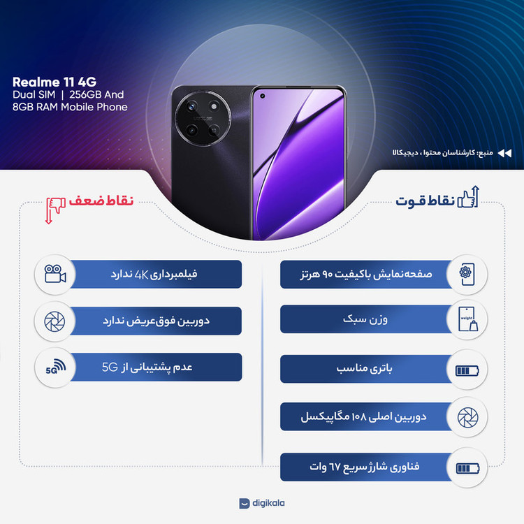 در بین گوشیهای هوشمند میانرده شرکت ریلمی، شاهد رونمایی برخی از محصولاتی بودیم که به مشخصاتی فراتر از قیمت در نظر گرفت شده برایشان مجهز شده بودند و موبایل ریلمی مدل 11 4G یکی از آنها است. این گوشی از صفحهنمایش با ابعاد 6.4 اینچ با رزولوشن 1080×2400 پیکسل از نوع سوپرامولد بهره برده است. با توجه به توانایی نمایش 411 پیکسل در هر اینچ، نرخ بروزرسانی 90 هرتز و حداکثر روشنایی 1000 نیت (nits)، در کنار هم سبب شدهاند تا با صفحهنمایش بسیار باکیفیتی روبهرو باشید که عملکرد روان و بدون لگ، وضوح تصویر بسیار خوب حتی زیر تابش مستقیم نور خورشید و کیفیت تصویر بسیار خوب را دارد. در قسمت پشتی این گوشی درست است که جای خالی دوربین فوقعریض یا همان ultrawide حس میشود، اما بهره بردن از سنسور دوربین اصلی قدرتمند 108 مگاپیکسل که عملکرد بسیار خوبی در عکاسی نور روز و نور شب دارد، سبب شده تا جای خالی دوربین فوقعریض چندان به چشم نیاید. برای دوربین سلفی هم سنسور با رزولوشن 16 مگاپیکسل در نظر گرفته شده است که برای عکاسی نور روز عملکرد مناسب و قابل قبولی دارد. بهره بردن از پردازنده هلیو G99 شرکت مدیاتک هم سبب شده تا ریلمی 11 4G در اجرای بازیهای محبوب و نرمافزارهای کاربردی، عملکرد بسیار خوبی داشته باشد. باتری با میزان ظرفیت 5000 میلیآمپرساعت هم انتخاب بسیار مناسبی بود که به ازای هر بار شارژ صد درصدی، زمان آماده بهکار دو روز را در حالت استفاده معمولی فراهم کرده است. در مجموع اگر به دنبال خرید گوشی هوشمند میانرده با قیمت مقرون بهصرفهای هستید که از صفحهنمایش قدرتمند، دوربین بسیار خوب برای عکاسی نور روز و نور شب، پردازنده مناسب برای اجرای بازی و باتری مناسبی بهره برده باشد، ریلمی 11 4G میتواند یکی از بهترین انتخابهای ممکن برای شما باشد.