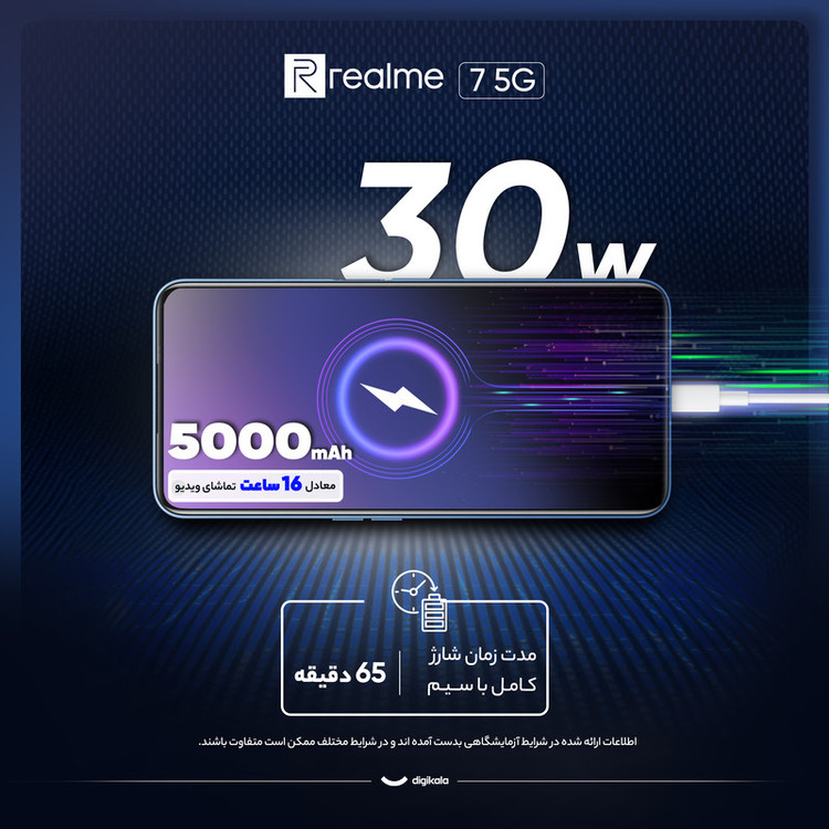 برند ریلمی یکی از برندهای زیرمجموعهی کمپانی اوپو (oppo) است که با وجود نوظهور بودن آن، امروزه به عنوان یکی از برندهای محبوب تولید موبایل و گجتهای هوشمند و ابزار دیجیتال محسوب میشود که میتوان تولیدات آن را با محصولات شیائومی و دیگر برندهای میانرده مقایسه کرد. گوشی موبایل ریلمی مدل 7 5G RMX2111 با قابلیت قرار دادن دو سیم کارت و ظرفیت 128 گیگابایتی همراه با رم 8 گیگابایت دارای طراحی زیبایی است که در نوامبر 2020 به بازار عرضه شده و نسبت به کارایی قیمت مناسب و ارزش خرید بالایی دارد. تراشه MediaTek MT6853 Dimensity 800U 5G (7 nm) به همراه پردازنده گرافیکی Mali-G57 MC3 سرعت و کیفیت بالایی را برای این موبایل به ارمغان آورده است. صفحهنمایشی با پنل IPS و تراکم پیکسلی 405 پیکسل بر هر اینچ در این مدل از تولیدات ریل می به چشم میخورد. این محصول بنا به ادعای شرکت سازنده دارای قابلیت شارژ سریع با توان 30 وات و باتری لیتیوم پلیمری با ظرفیت 5000 میلیآمپر ساعت است که این قابلیت شارژ سریع در کنار ظرفیت بالای باتری شما را از شارژ مداوم و طولانی مدت موبایلتان بینیاز خواهد کرد. گوشی موبایل ریلمی مدل 7 5G RMX2111 دو سیم کارت ظرفیت 128 گیگابایت و رم 8 گیگابایت میتواند یک انتخاب هوشمندانه برای شما باشد تا از گوشی موبایل خود و کارهایی که از آن برمیآید لذت ببرید.